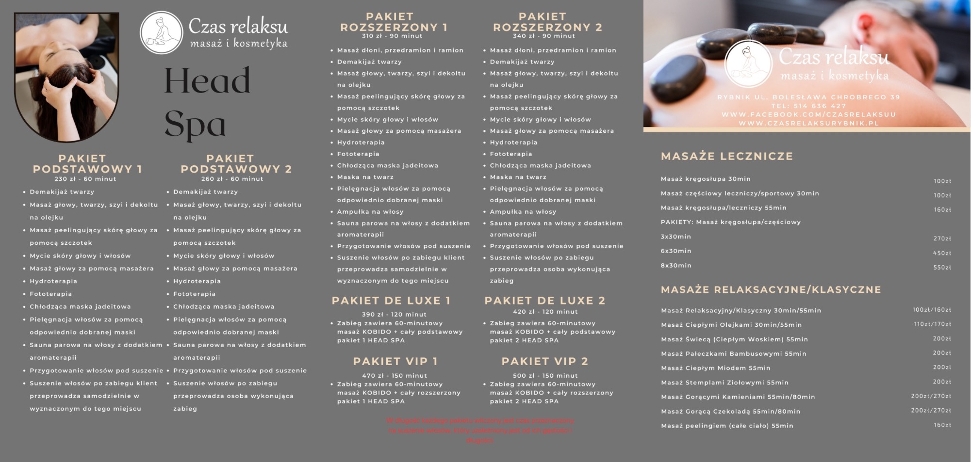 Zapraszamy do naszego salonu masażu „Czas Relaksu z Rybnika”, gdzie zapomnisz o codziennych problemach i stresie. Nasz wykwalifikowany personel zadba o Twoje ciało i umysł poprzez relaksacyjne masaże, które pobudzą krążenie i pozytywnie wpłyną na Twoje samopoczucie. Oferujemy szeroki wybór masaży, w tym klasyczny, relaksacyjny, gorącymi kamieniami czy aromaterapeutyczny. W naszym komfortowym gabinecie zadbamy o Twoją prywatność, a ręczniki i kosmetyki użyte podczas masażu spełniają najwyższe standardy higieniczne. Rezerwuj już dziś swoją wizytę i delektuj się wspaniałym doświadczeniem Czasu Relaksu.